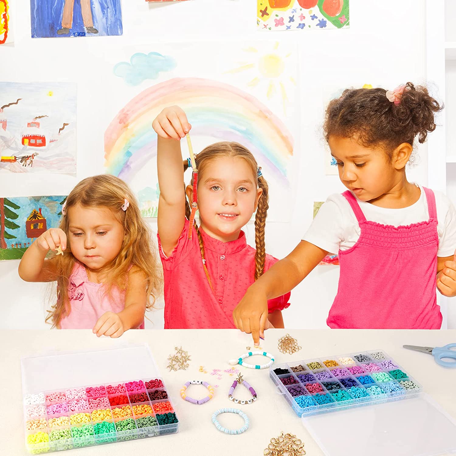QUEFE 14420pcs Clay Beads for Bracelet Making Kit, 56 Colors Spacer Heishi Beads Flat Round Polymer Clay Beads with Pendant Charms Kits and Elastic Strings