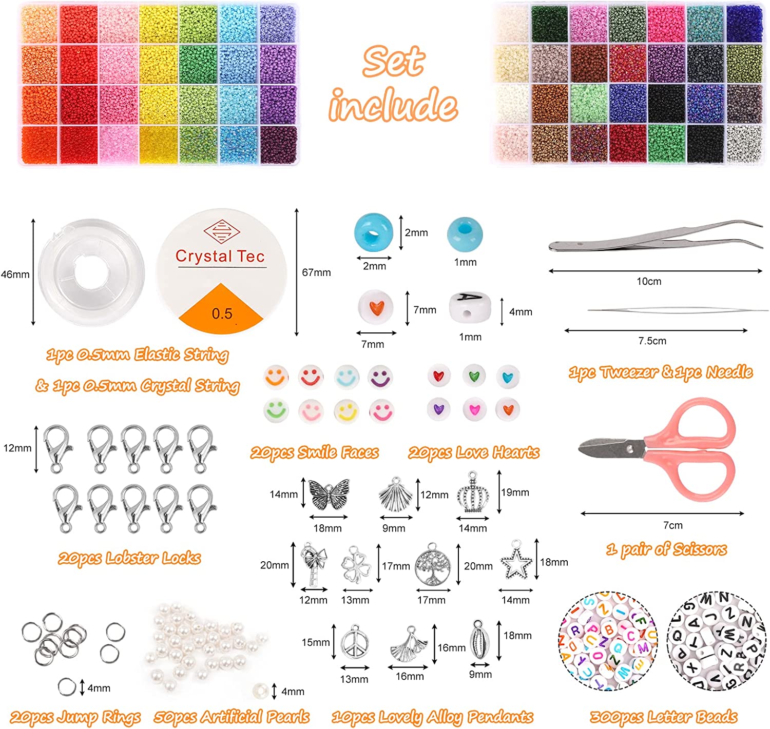 Quefe 45000pcs Glass Seed Beads 56 Colors 2mm Small Beads for Jewelry Making Kit, 260pcs Letter Beads Smiley Face Beads Heart Beads Pearls Rings Lobster Locks Pendants Charms Elastic String