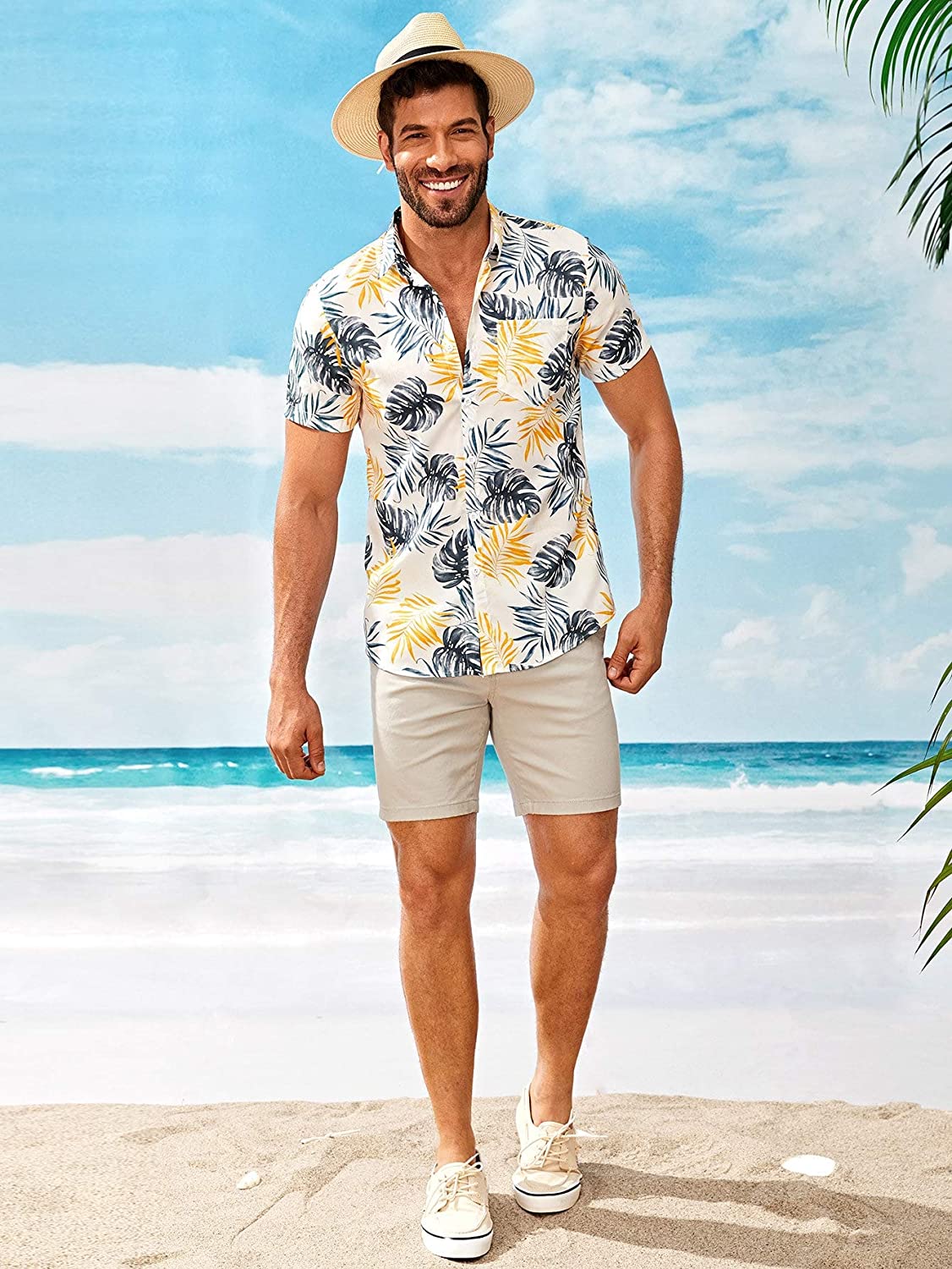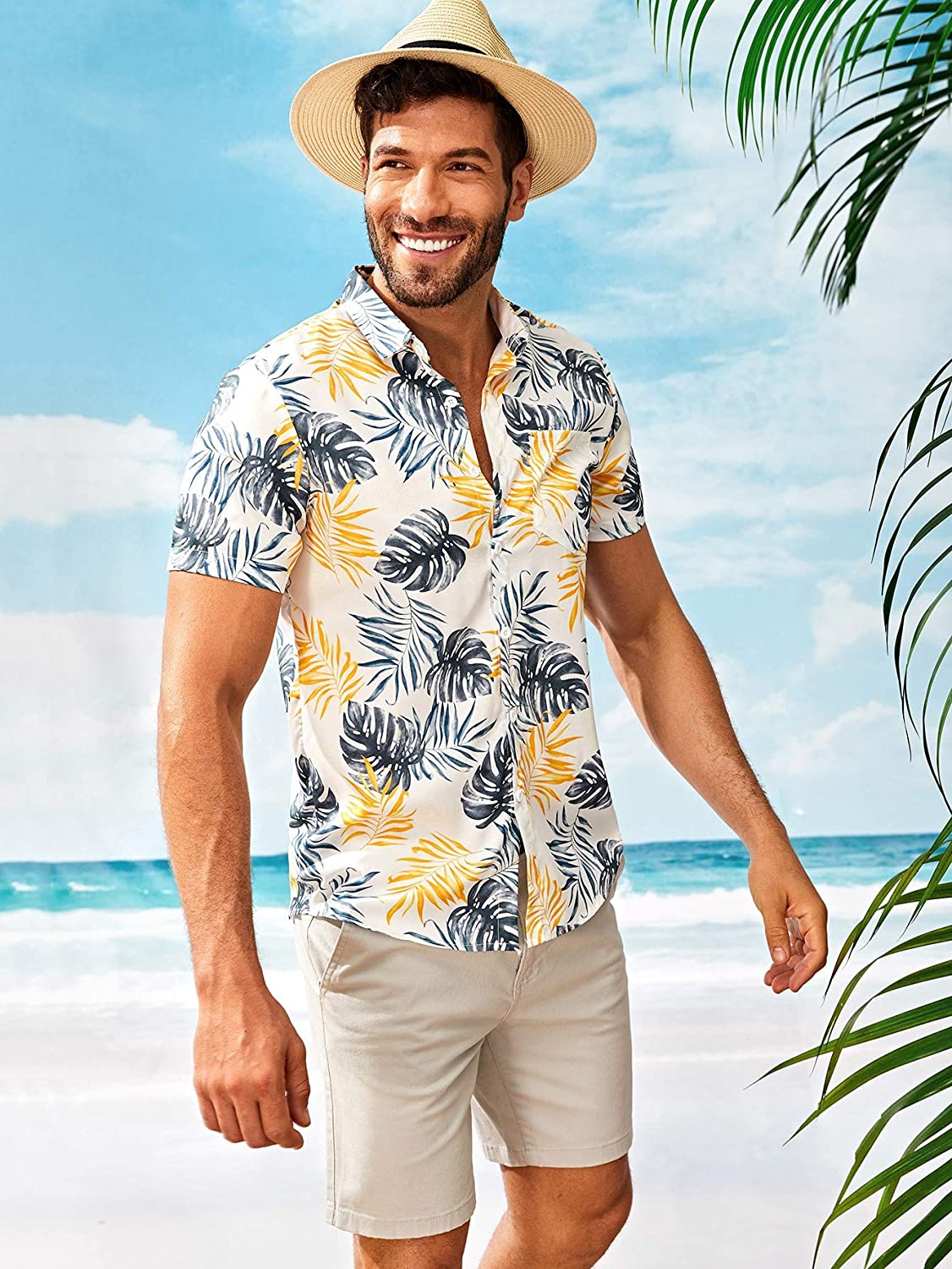 Romwe Men's Short Sleeve Hawaiian Shirt Tropical Print Casual Button Down Aloha Shirt