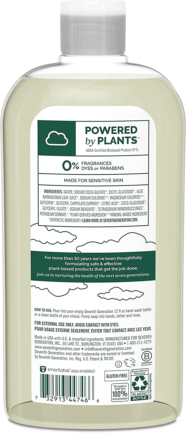 After 25 years of innovation, we've learned a thing or two from plants: they can clean up our world while being kind to our families. Seventh Generation plant-based Hand Wash gets the job done with no dyes, no triclosan and is fragrance free. Our unscented hand soap is made for sensitive skin and gentle on your hands. Life is complicated. Choosing a liquid hand soap should be simple. This Hand Wash Refill will fill up your Seventh Generation bottle twice. Better yet? Not just a hand soap refill but try this as you New favorite Body Wash. The gentle plant-based formula in Seventh Generation Hand Wash & Body Soap is made with renewable cleaning ingredients that leaves your hands and body clean, soft and refreshed. Everything should be this easy.