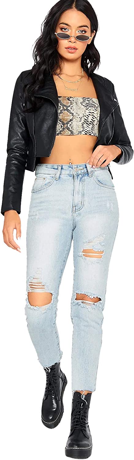 SheIn Women's Zipper Front Casual PU Leather Cropped Jacket Long Sleeve Bolero