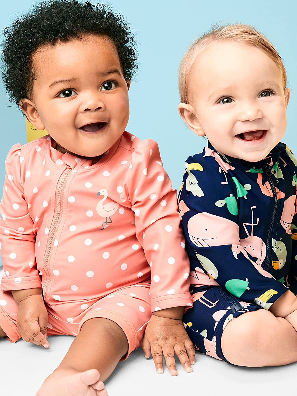 Help keep her covered from sun, sand + salt with these long-sleeve rashguards featuring a full zip front for easy on and off, mock necks, cute ruffles on the bum and sweet sea characters. Plus, a handy 2-pack means more fun in the sun!