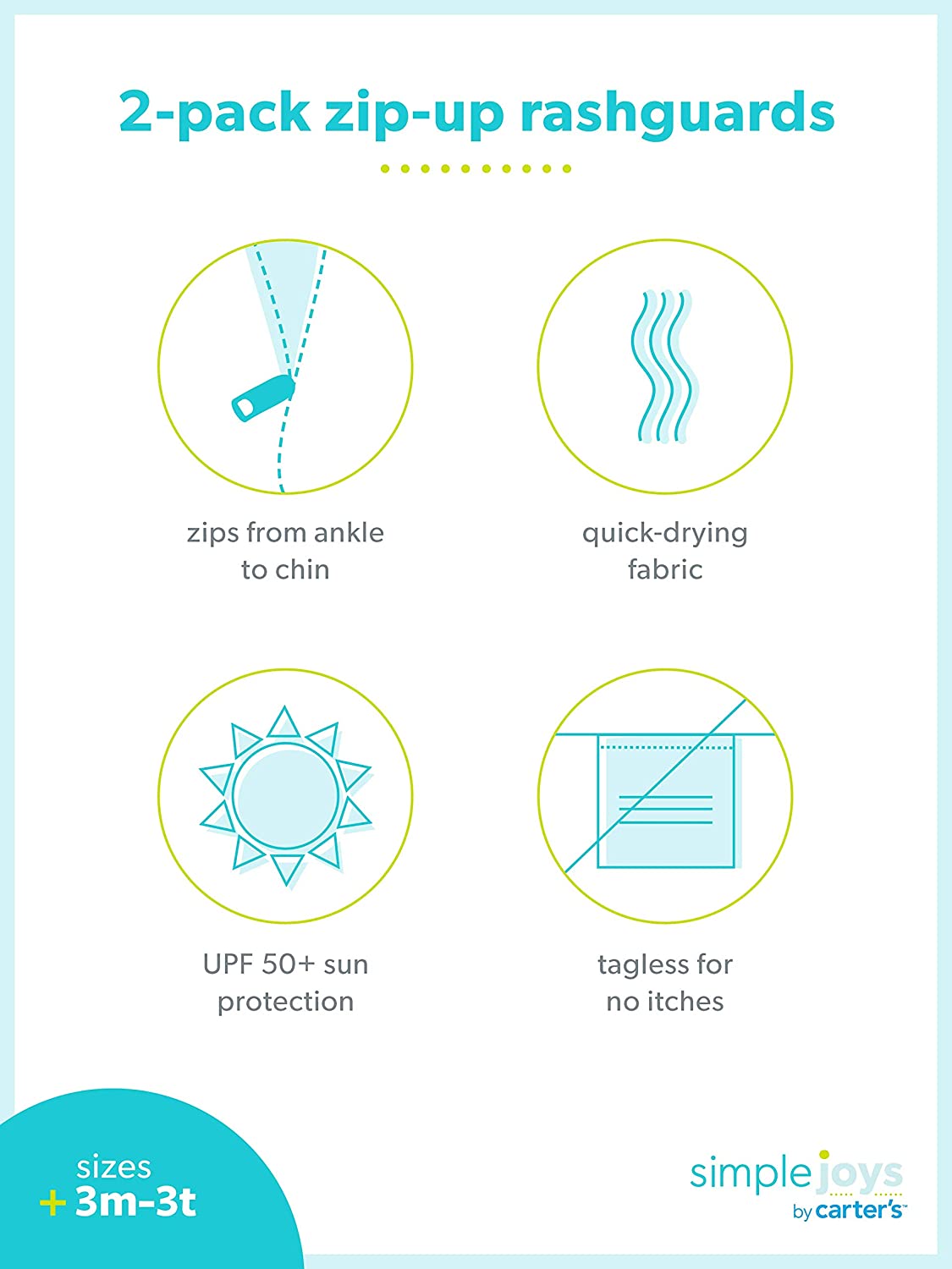 Help keep her covered from sun, sand + salt with these long-sleeve rashguards featuring a full zip front for easy on and off, mock necks, cute ruffles on the bum and sweet sea characters. Plus, a handy 2-pack means more fun in the sun!