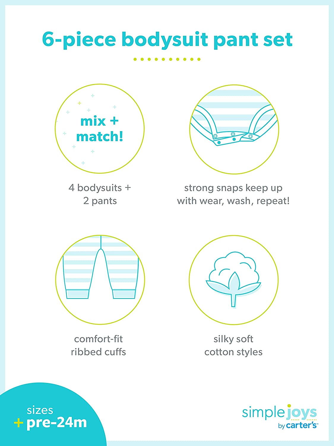 Perfect for the diaper bag. With two long-sleeve bodysuits, two short-sleeve bodysuits, plus easy pull-on pants to match, this soft cotton set for baby comes with extra outfits to spare!