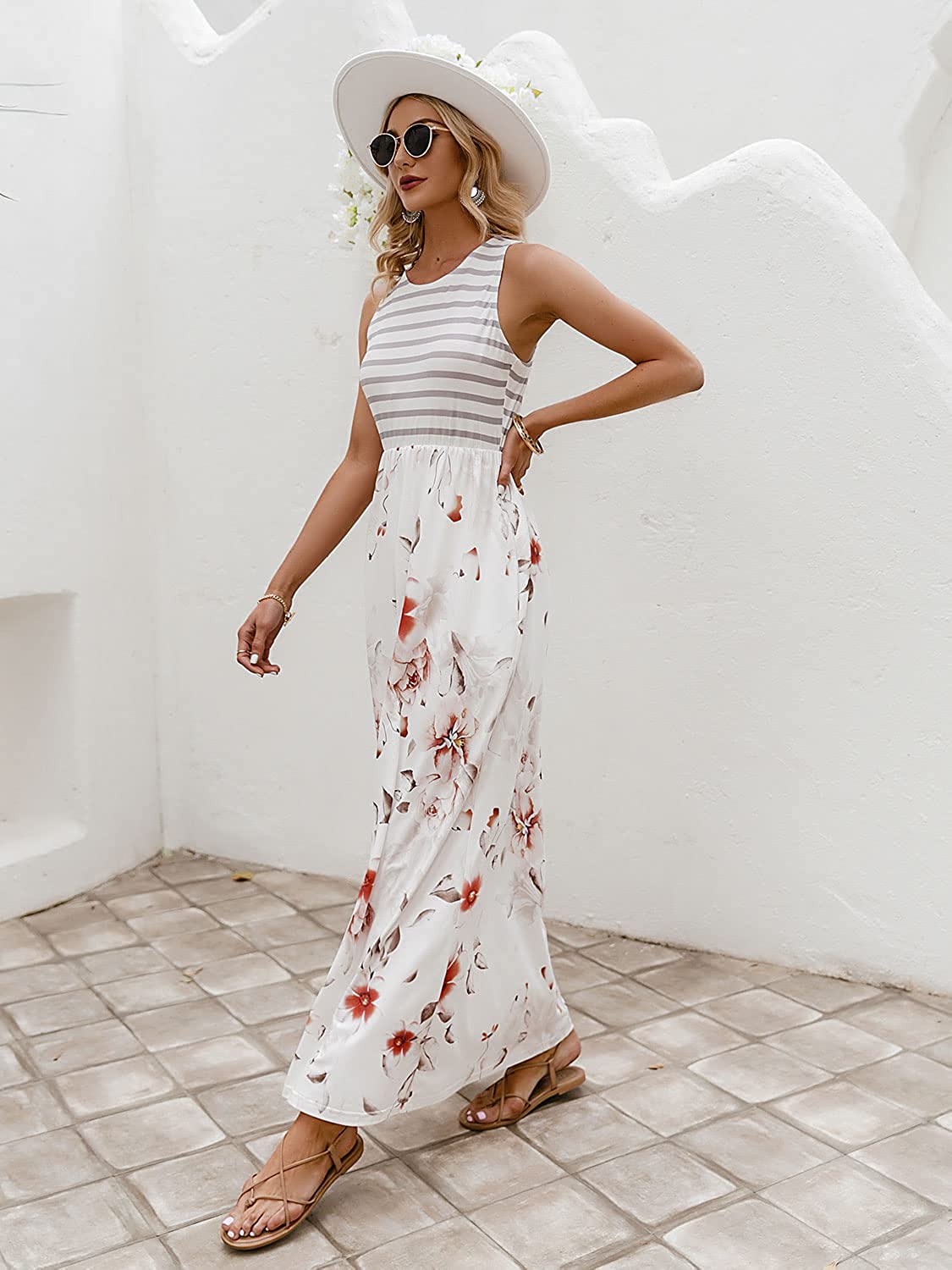 Simplee Women's Sleeveless Floral Printed Casual Maxi Dress Striped Summer Long Dress