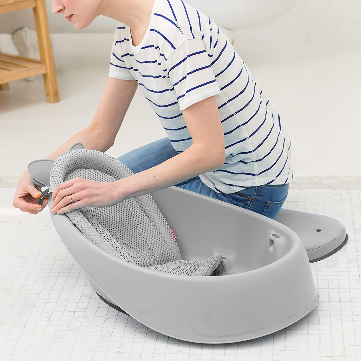 Our cheerful whale-shaped Moby tub grows with baby through three stages and offers Smart Sling™ support. The sling locks into two ergonomic positions: higher for full-body support and lower for seated support. Dual layered mesh and comfort-edge construction securely cradles baby from head-to-toe. The slings adjusts to a cushioned seat that comfortably supports babies learning to sit. Remove the sling when baby has mastered sitting and easily bathe baby in the spacious tub—no uncomfortable plastic bumps.
