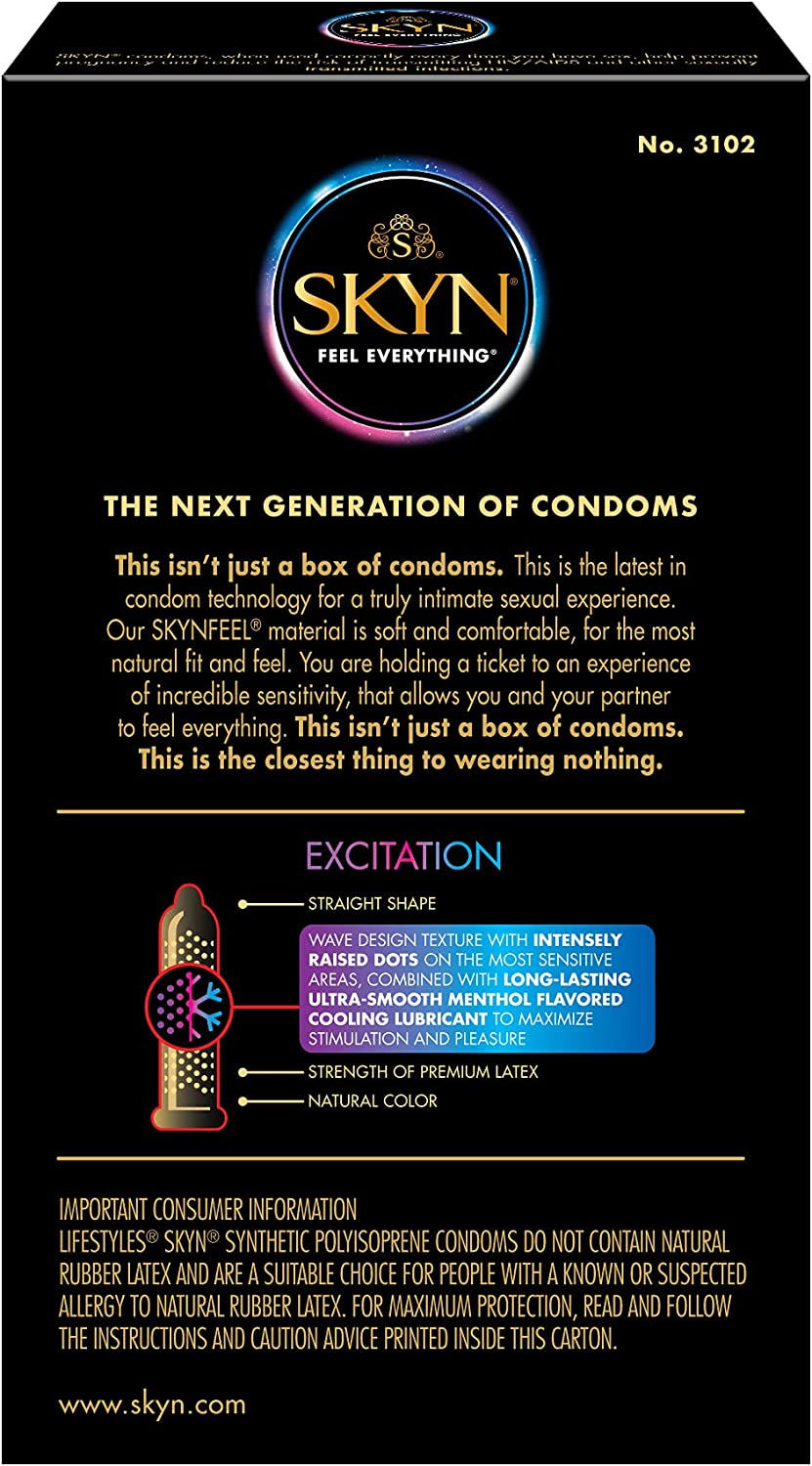 SKYN Excitation combines a wave design texture with intensely raised dots on the most sensitive areas. Together with a long-lasting, ultra-smooth cooling lubricant, it maximizes stimulation and pleasure for both partners. Excite your senses. Intensify your intimacy.