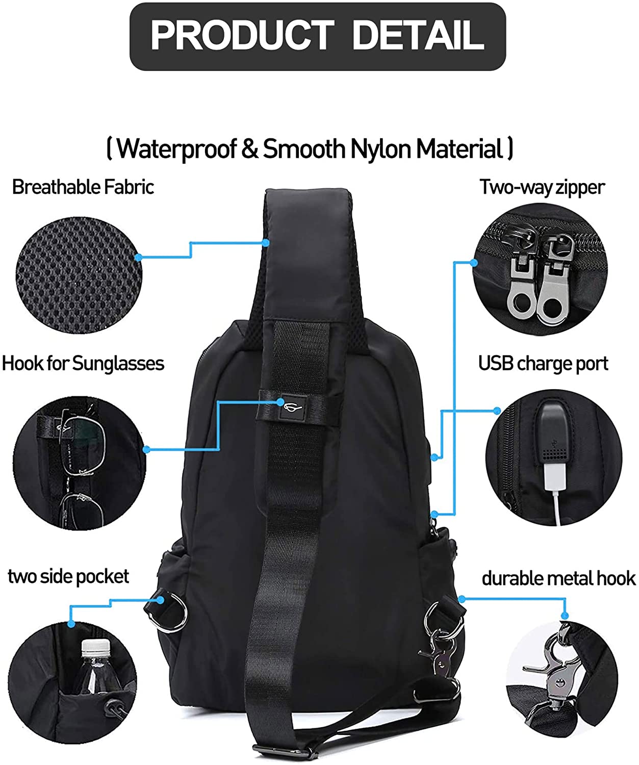 Small Black Sling Crossbody Backpack Shoulder Bag for Men Women, Lightweight One Strap Backpack Sling Bag Backpack for Hiking Walking Biking Travel Cycling USB Charger Port-Nylon