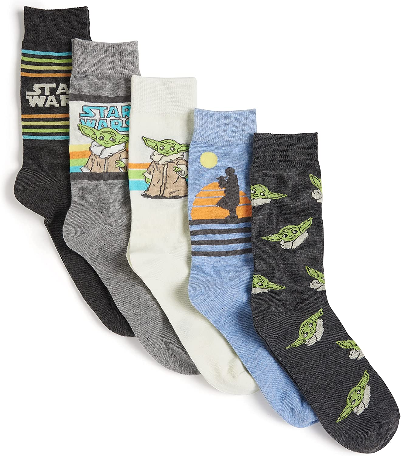 This assortment of Star Wars socks includes a variety of 5 crew sock pairs with different prints. The fun designs are perfect for all Star Wars fans and will bring a smile to anyone’s face. These character socks are machine washable and are made of durable and breathable fabrics consisting of 98% polyester and 2% spandex. Five designs to a pack offer variety and flexibility. Wear your favorite character to brighten your day or the day of those around you. Easy to pull on, the socks stretch over the foot and stay comfortably inside shoes. No matter if you wear these socks under your office attire or with your favorite weekend ensemble, you are sure to impress and add a bit of fun to your wardrobe.