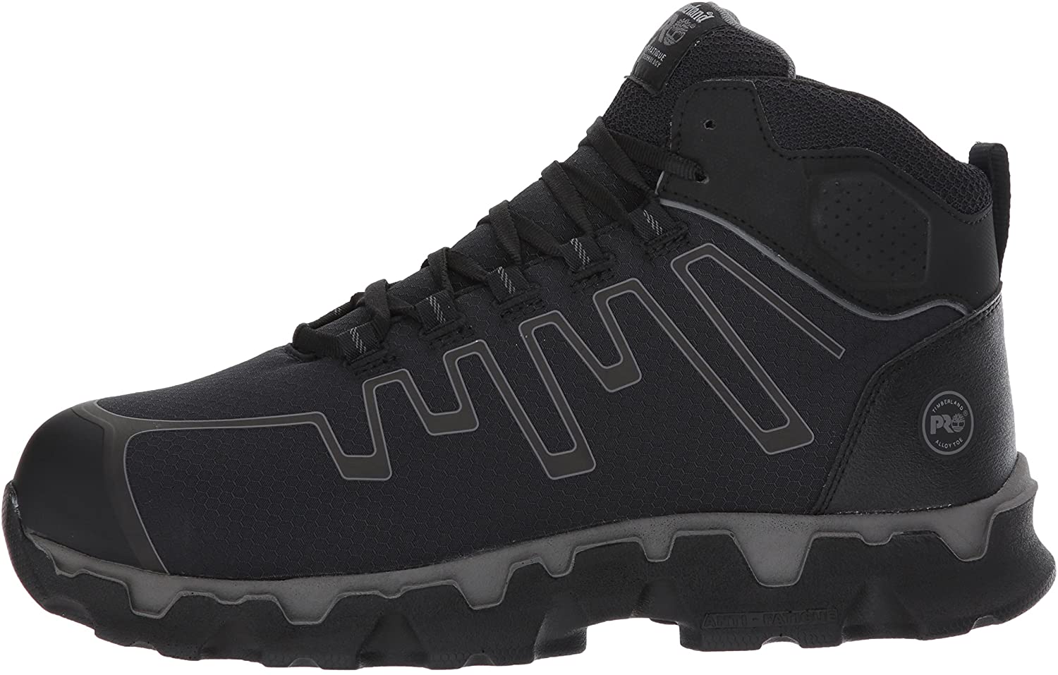 Men's Timberland Pro, Powertrain Sport Mid Alloy EH Work Boot. These work boots will provide the ultimate in protection and comfort. Perfect for industrial or warehouse work. Metal free upper design with manmade and fabric featuring an alloy safety toe for lightweight protection Lace up closure for a secure fit with a padded tongue and collar for added support Fabric lining with antimicrobial treatment for odor control with a cushioned footbed for added comfort Anti-fatigue technology built in the outsole helps absorb shock and returned energy to key ones of the foot Electrical safe design with Timberland Pro 24/7 comfort suspension for ultimate comfort Slip, oil- and abrasion-resistant with static dissipative and non-marking rubber outsole. Heel Height of 1.50 inches