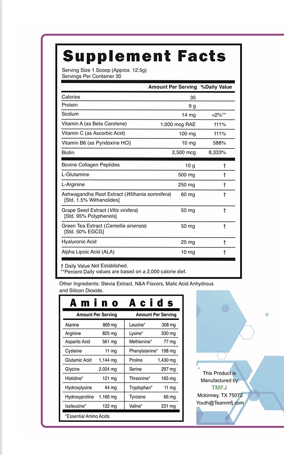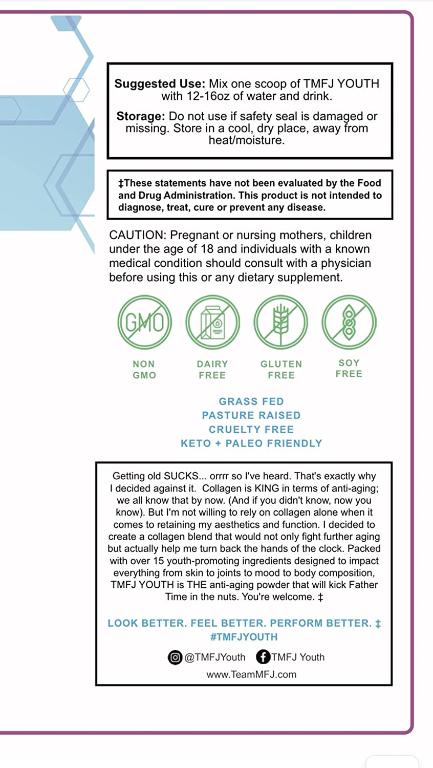 Truly the best collagen peptide blend on the market today, with ingredients proven to be anti-aging, boost metabolism, enhance joint function and decrease joint pain, balance your mood, boost hair growth, improve skin elasticity-tone-brightness, and speed up recovery. With a full amino acid panel included, YOUTH is truly geared toward the aesthetics- minded athlete or adult. There is no other collagen peptide ingredient panel like ours!