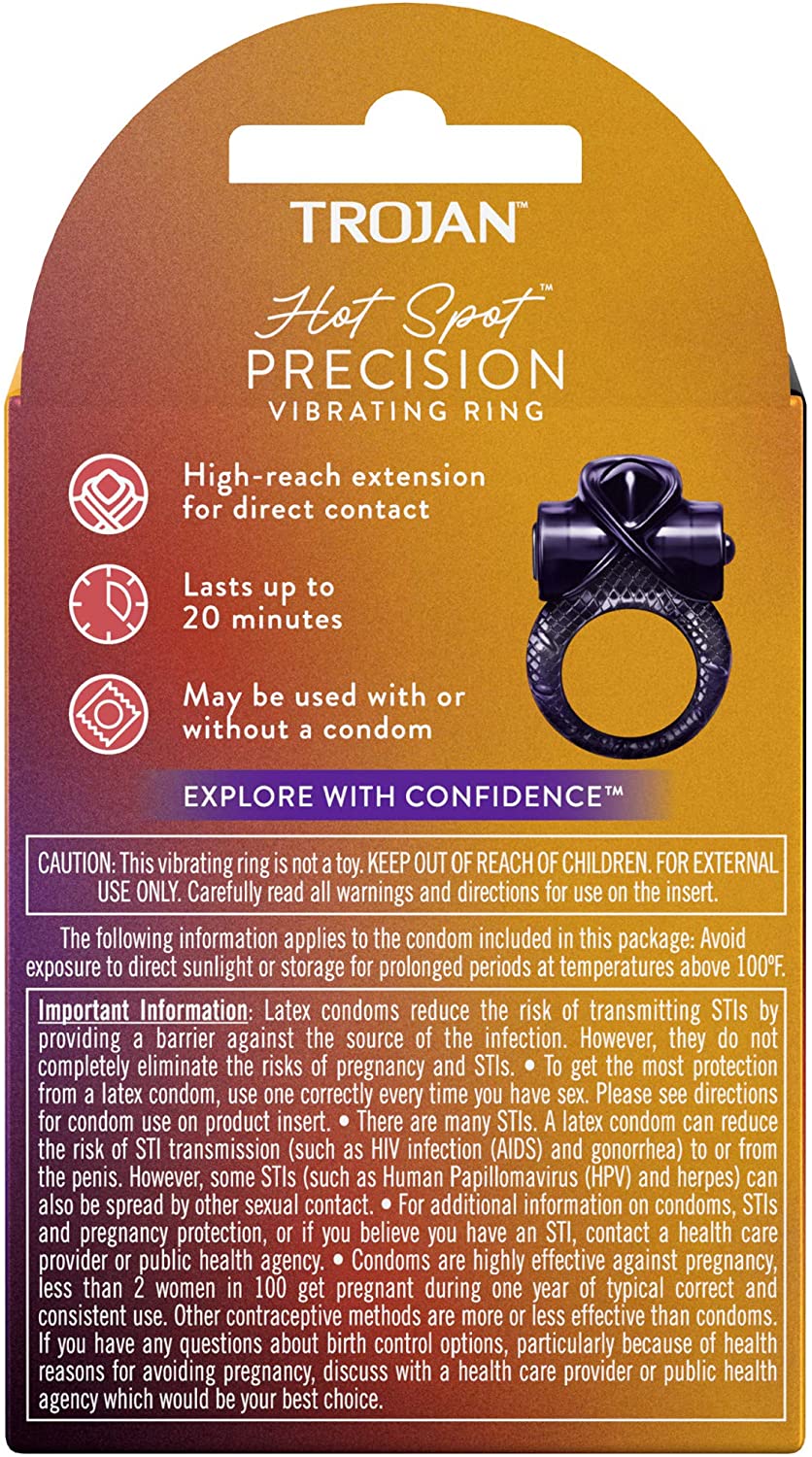 Take pleasure to new heights with TROJAN Vibrations Hot Spot Vibrating Ring. When he puts it on, this ring has a high reach extension for direct contact for her and more intense stimulation during intercourse for both partners. Designed to be used with or without a condom, it delivers spot-on pleasure every time. The vibrations last up to 20 minutes for one time use so you and your partner are guaranteed a night to remember. Includes one TROJAN Vibrations Hot Spot Vibrating Ring. More Americans trust TROJAN Brand than any other condom, for over 100 years, because we’re committed to investing in public health efforts to support sexual health. The TROJAN Brand promotes a safe, healthy, and fun sex life. From condoms to vibrators to lubricants, TROJAN Brand is dedicated to delivering innovative, high-quality products that offer pleasure and protection.