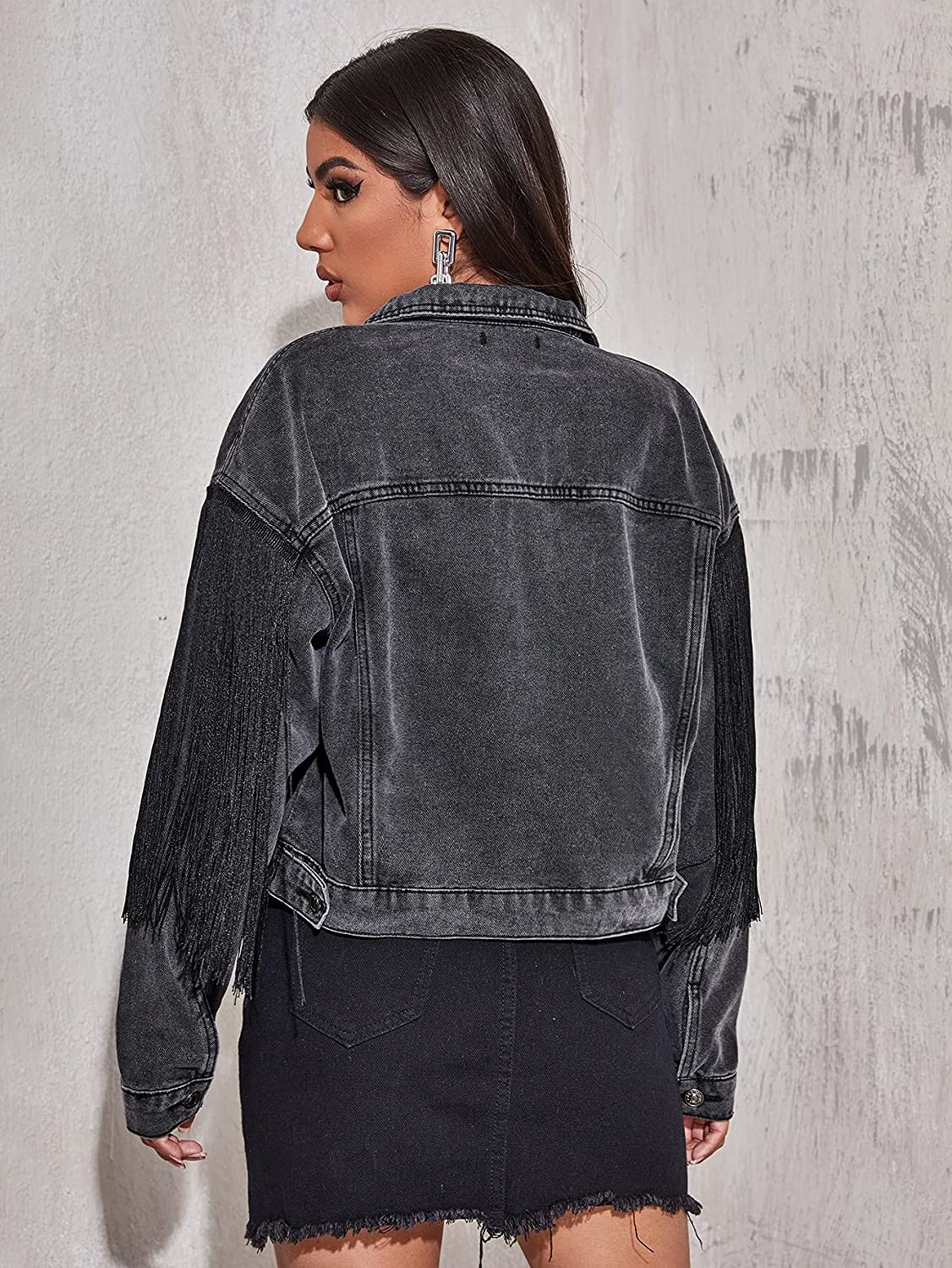 Verdusa Women's Button Front Fringe Trim Long Sleeve Drop Shoulder Denim Jacket