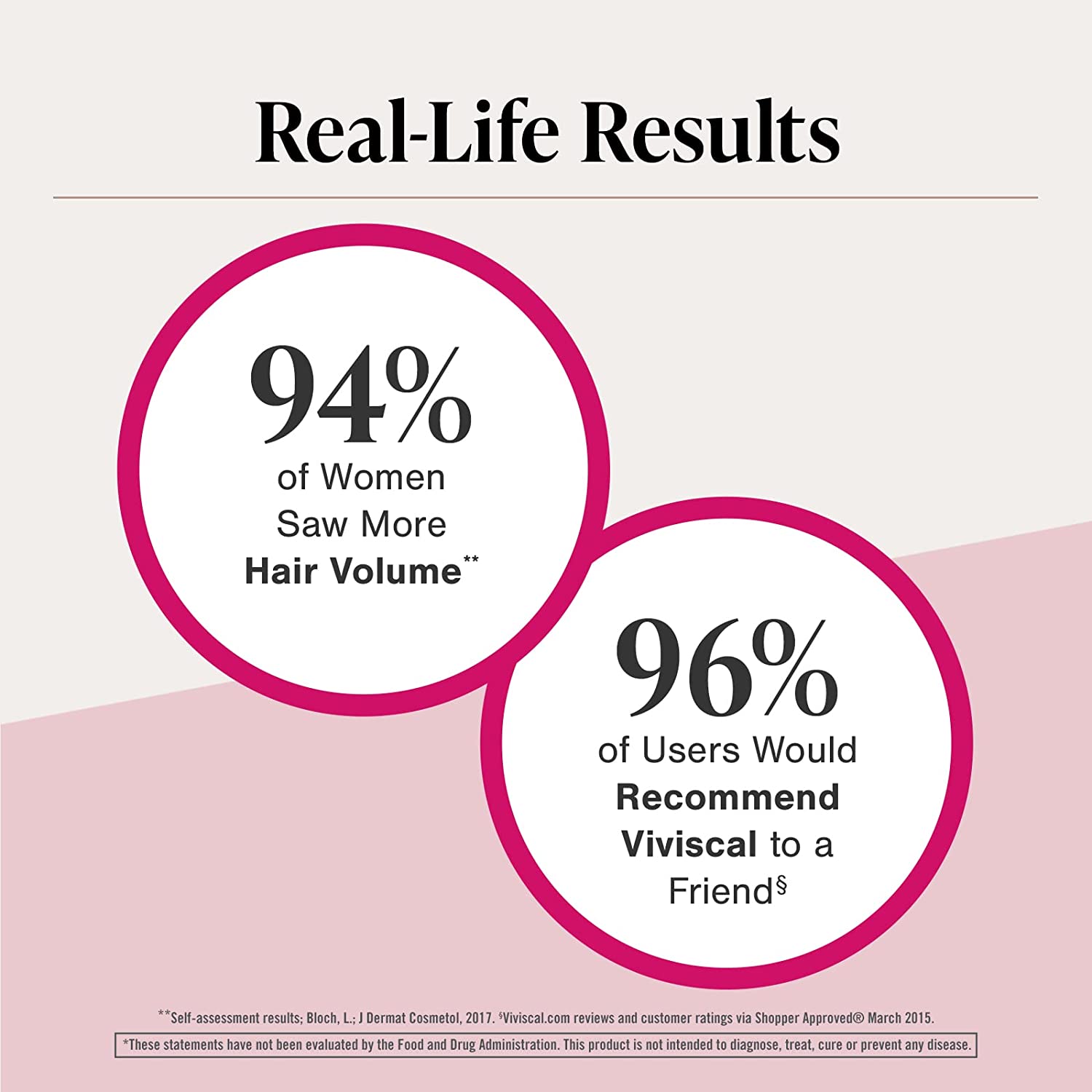 Stress, hormonal changes, poor nutrition, natural aging, menopause, post-pregnancy, heredity, medication and over styling can impact the health of your hair and lead to breakage and excess shedding. Viviscal Hair Growth Vitamin Supplements have been scientifically proven to nourish thinning hair and promote existing hair growth.[1] Why Viviscal Hair Growth Supplements? Brand Backed by 25 years of Research & Development with 10 published clinical studies 100% drug free Nourishes thinning hair and promotes existing hair growth from within #1 selling hair growth supplement in the U.S.[2] Surgery-free, easy-to-use solution for hair growth [1] Scientifically proven to improve hair thickness and reduce shedding in as little as 3 months [3] Suitable for all hair types - These statements have not been evaluated by the Food and Drug Administration. This product is not intended to diagnose, treat, cure or prevent any disease. 1 - Existing Growth 2 - Nielsen AOC 52 weeks ending December 28, 2019 3 - Ablon, G.; Dermatol Res Pract., 2015 (comparable formula) 4 - Bloch, L; J Dermat Cosmetol, 2017 (comparable formula) 5 - Based on consumer research of 110 consumers using Viviscal Densifying Shampoo, Conditioner and Elixir (September 2015). (comparable formulas) 6 - Based on studies of comparable formulas.