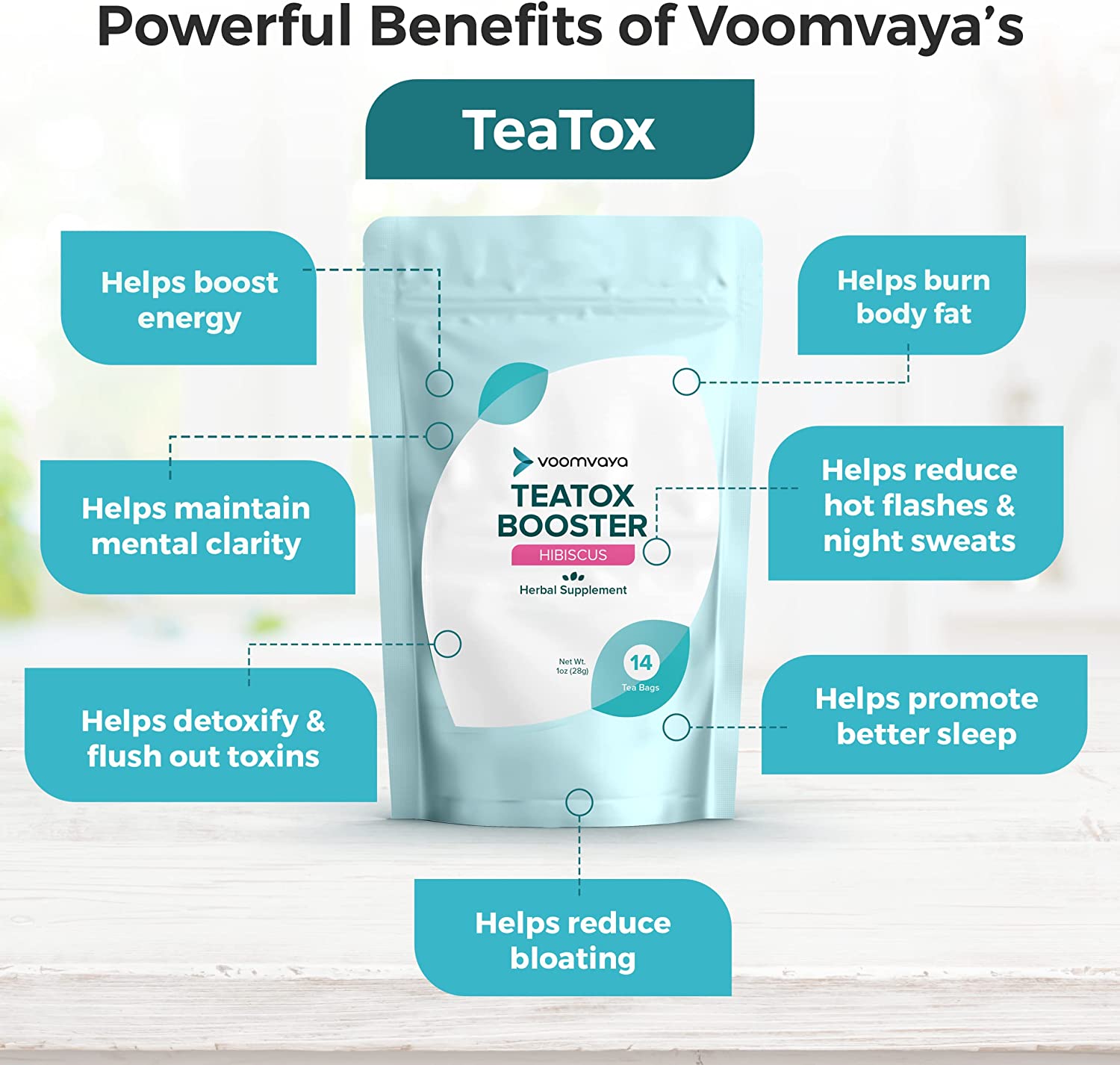 VoomVaya TeaTox Booster Detox Tea - 14-Day Herbal Detox Tea for Menopausal Women with Senna Leaf, Dandelion, Cardamom, Matcha - Healthy Metabolism & Balance Hormone - Hibiscus Flavor 14 Tea Bags
