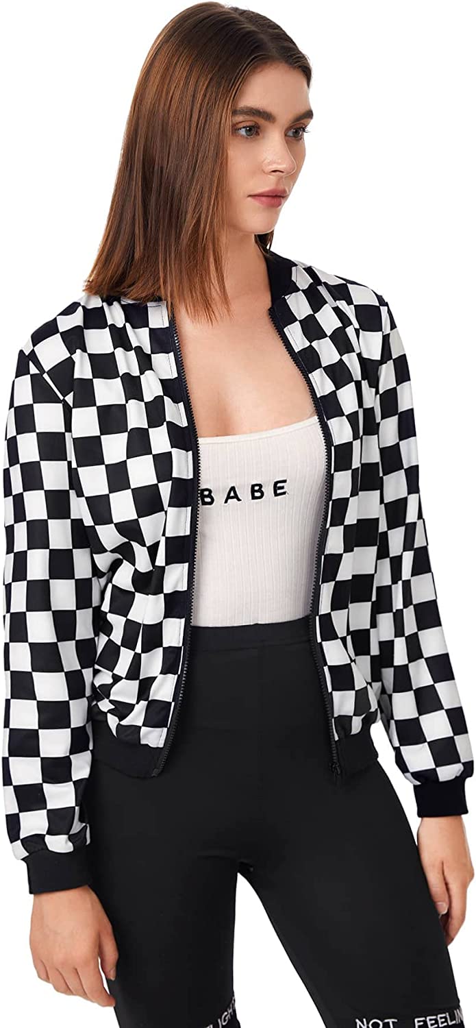 WDIRARA Women's Zip Front Plaid Print Long Sleeve Stand Collar Casual Jacket