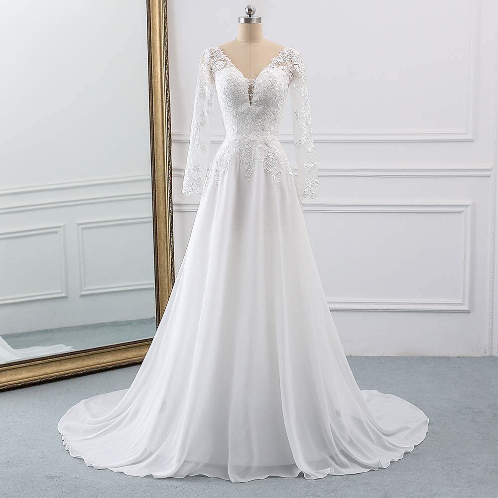 Wedding Dresses for Bride 2022 with Lace Appliques Chiffon Women Dress Long Sleeves Beach Bride Dress Ivory