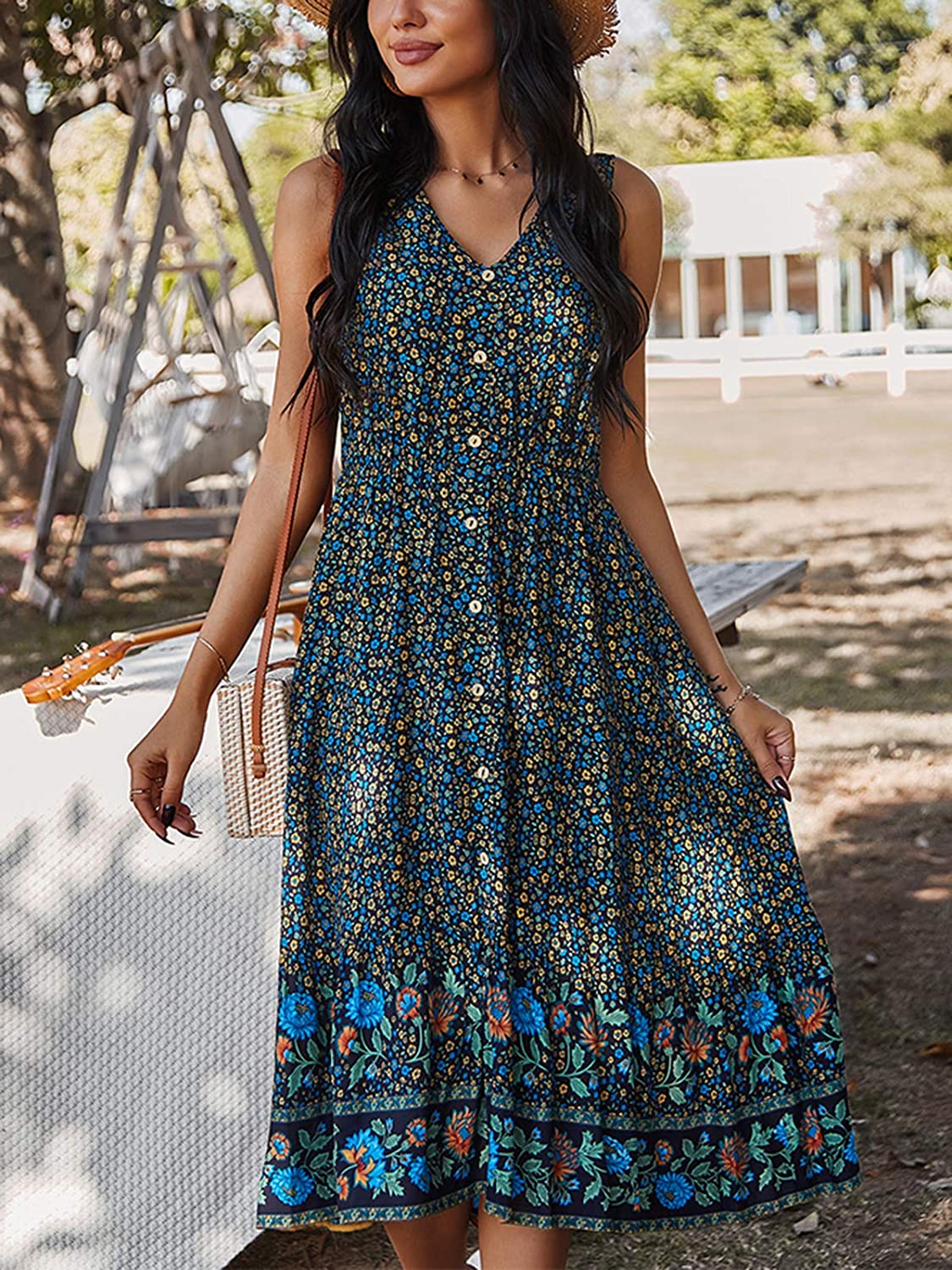 Women Dress Summer Sleeveless Floral Bohemian V Neck Button Down Flowy Dresses S-XL