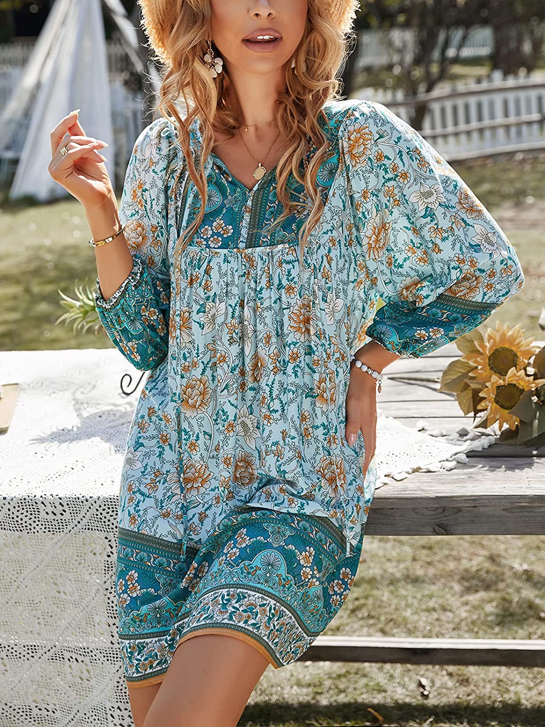 Women's Boho Dress Summer Mini Floral 3/4 Long Sleeve V Neck Flowy Loose Casual Beach Dresses