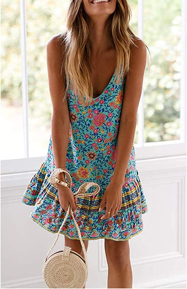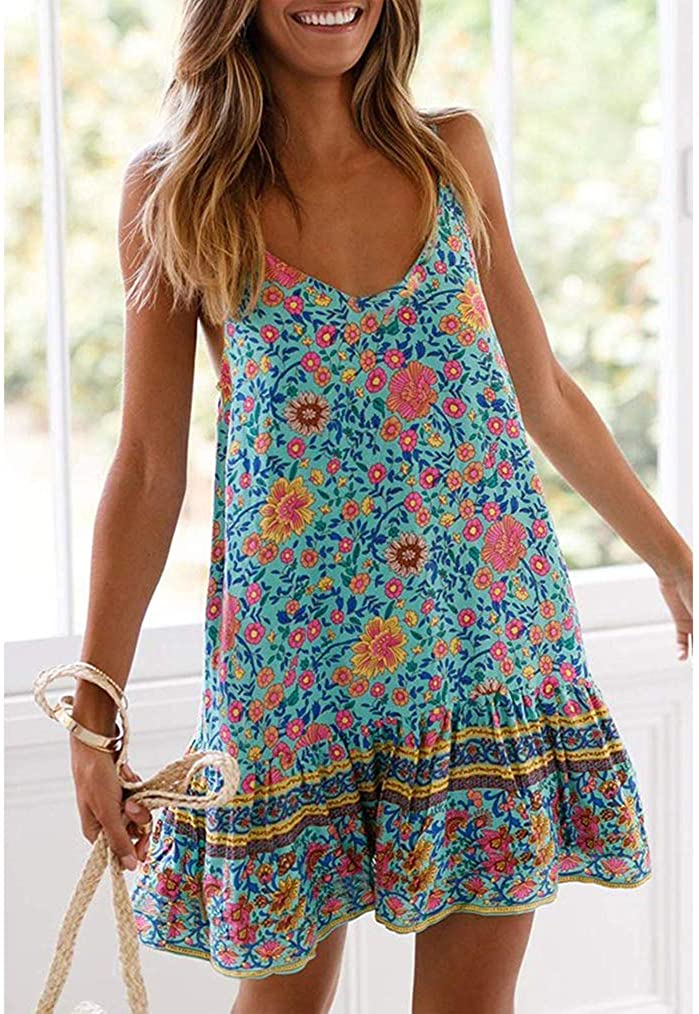 Womens Boho Floral Printed Dress Summer Sleeveless Adjustable Strap Beach Mini Dress with Pockets