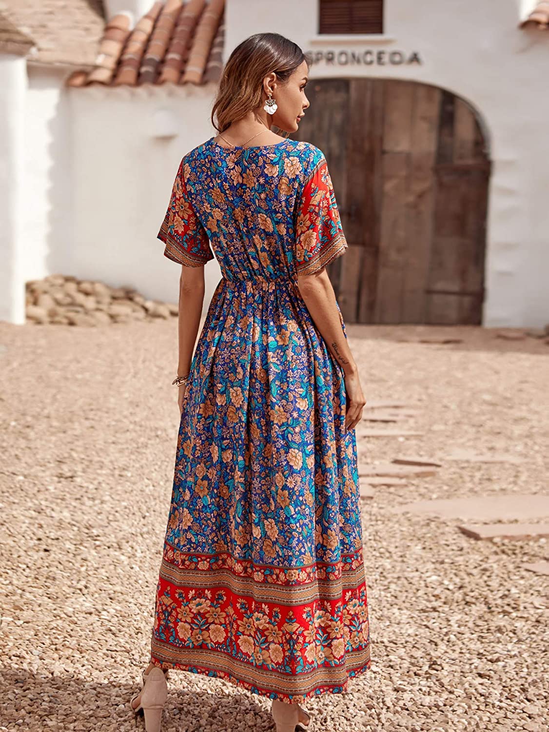 Women's Casual Floral Print V Neck Short Sleeve Summer Boho Beach Dress High Waist Long Maxi Dresses