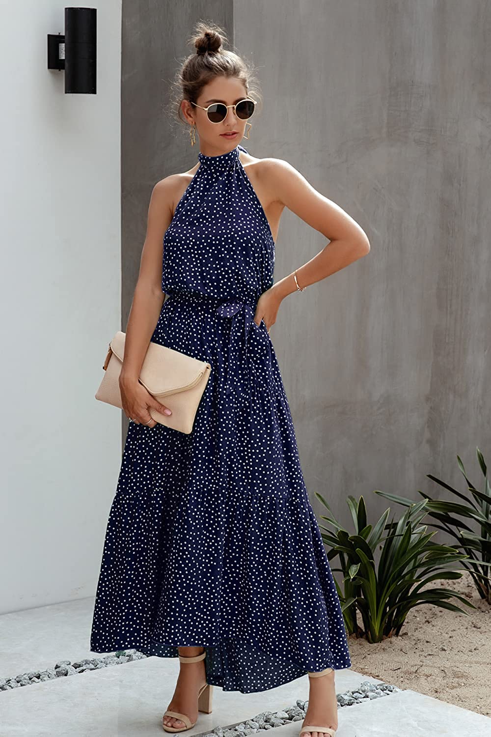 Women's Casual Halter Neck Sleeveless Floral Long Maxi Dress Backless Loose Ruffle Sundress with Belt