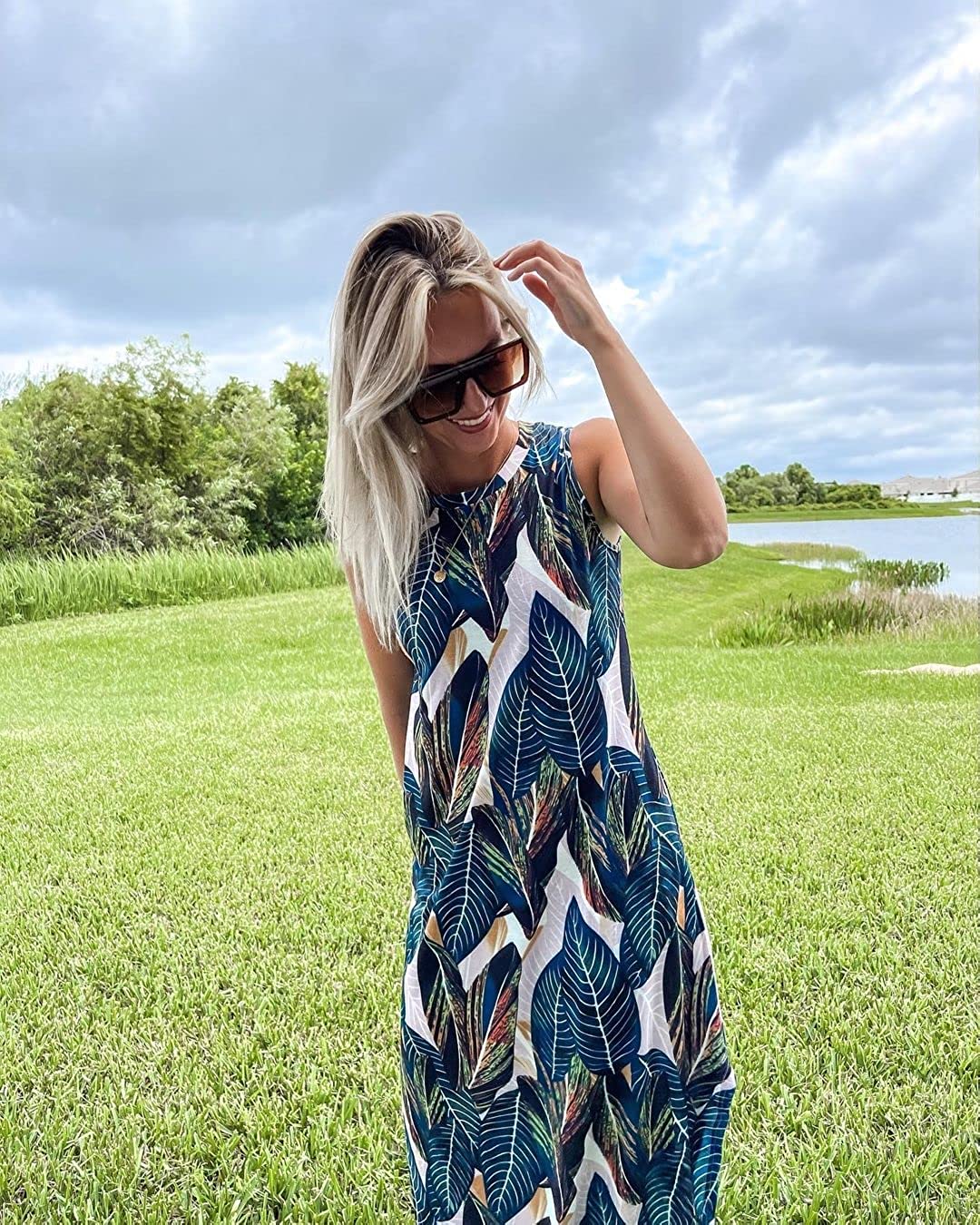 Women's Casual Loose Summer Long Dress Sleeveless Split Beach Maxi Dresses with Pockets