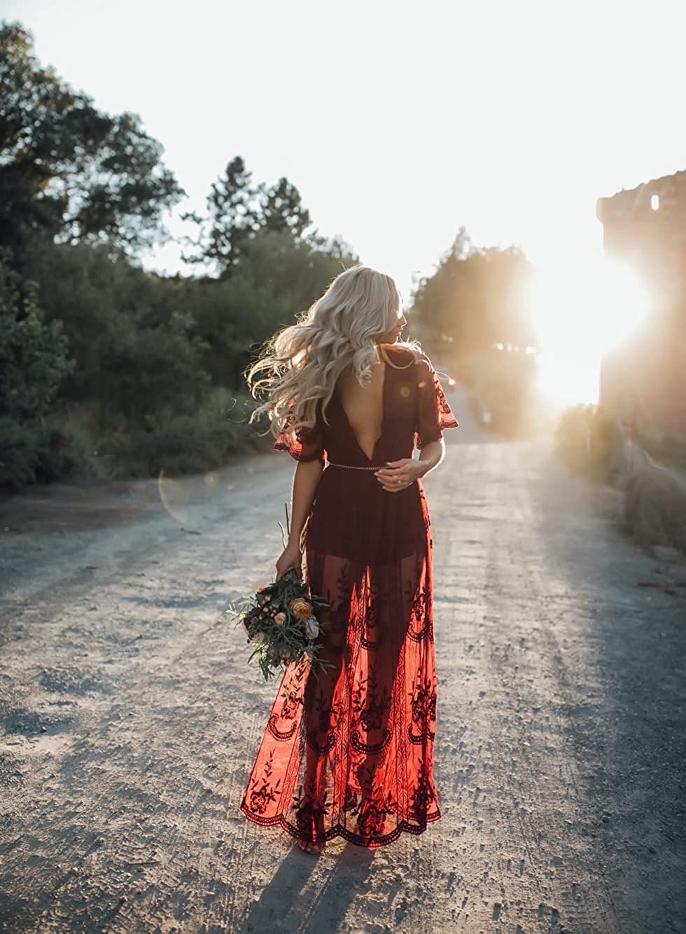 Women's Deep V-Neck Lace Romper Short Sleeve Long Dress