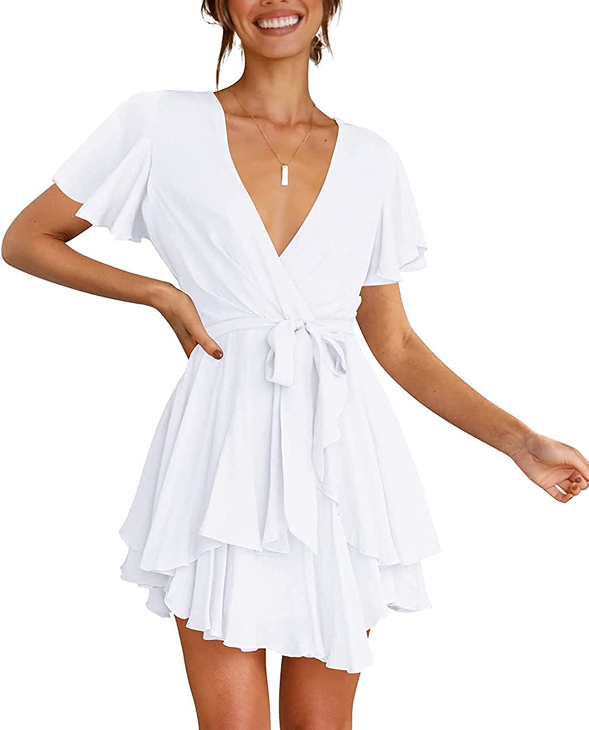 Women's Dress Deep V-Neck Long Sleeve Waist Tie Ruffle Mini Swing Skater Homecoming Dresses
