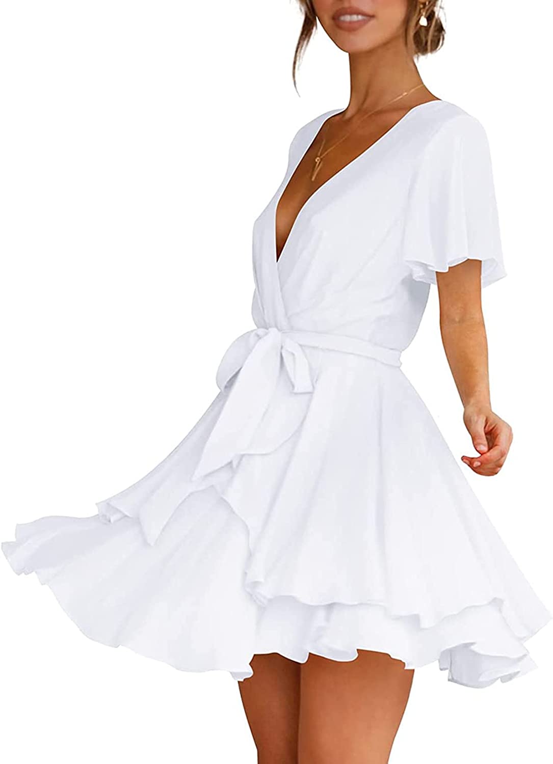 Women's Dress Deep V-Neck Long Sleeve Waist Tie Ruffle Mini Swing Skater Homecoming Dresses