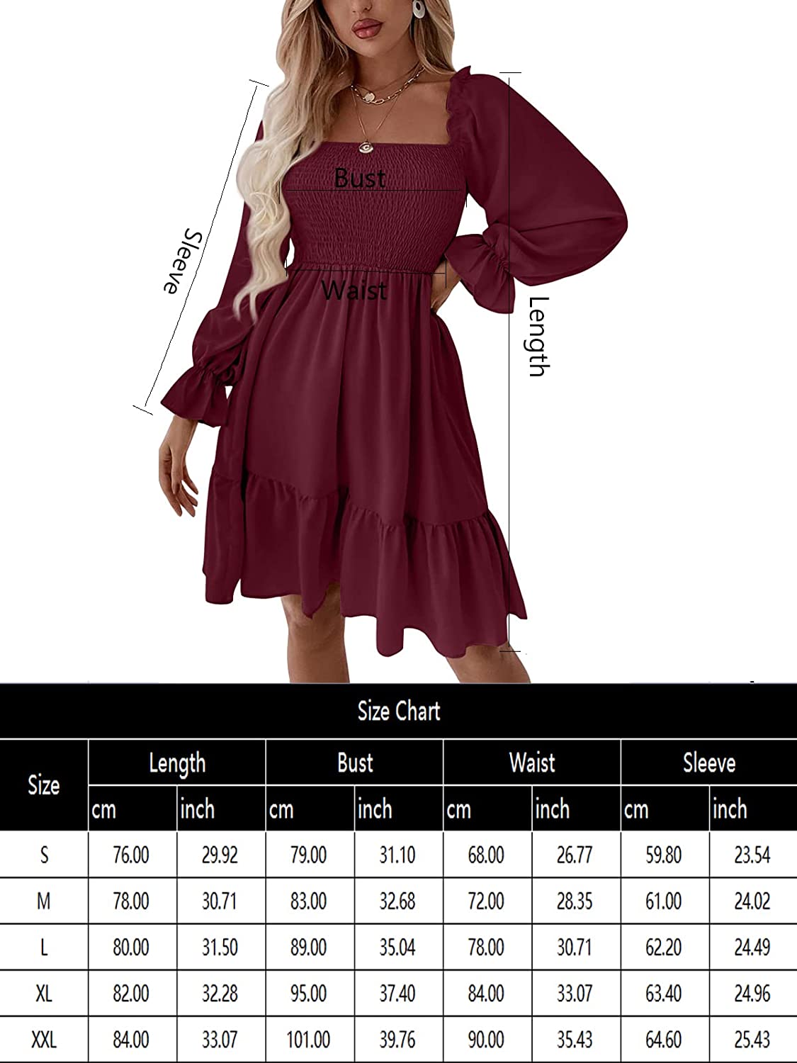 Womens Midi Dresses Solid Long Sleeve Dress Casual Square Neck High Waist A Line Ruffle Mini Short Dresses for Women