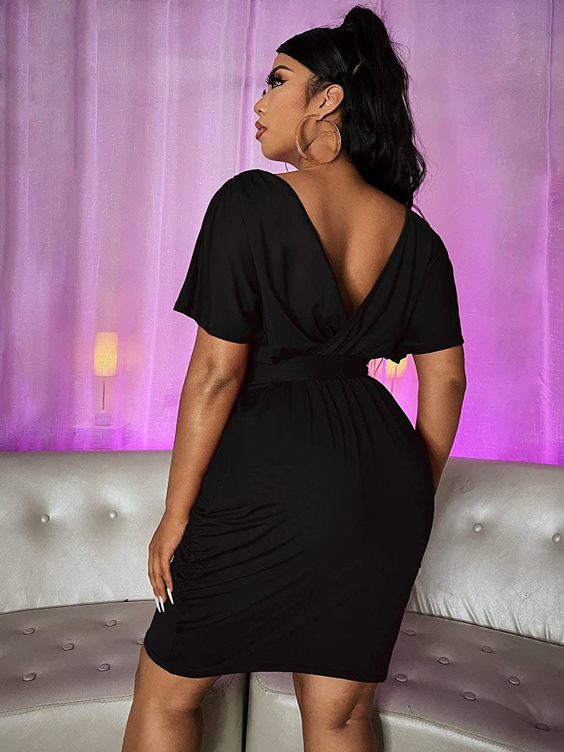 Women's Plus Size Short Sleeve Surplice Deep V Belted Ruched Mini Party Bodycon Dress