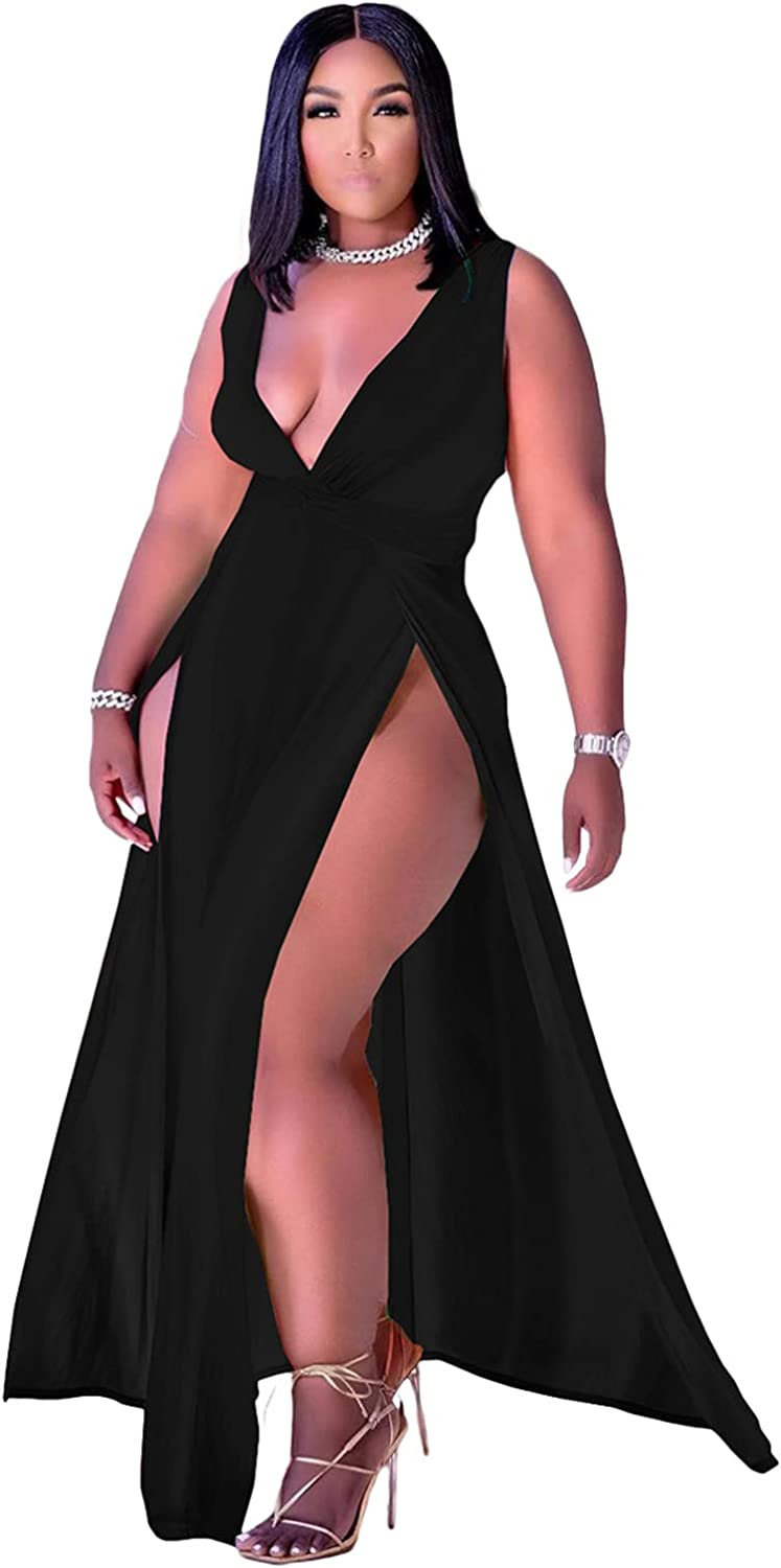 Women's Plus Size Sleeveless Deep V Neck Front Split Long Maxi Wrap Dress