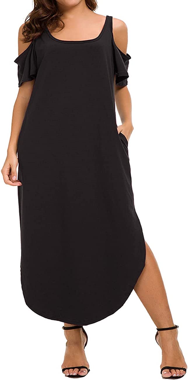 Women's Plus Size Summer Maxi Dresses Short Sleeve Casual Loose Plain Floral Print Split Long Dress with Pockets