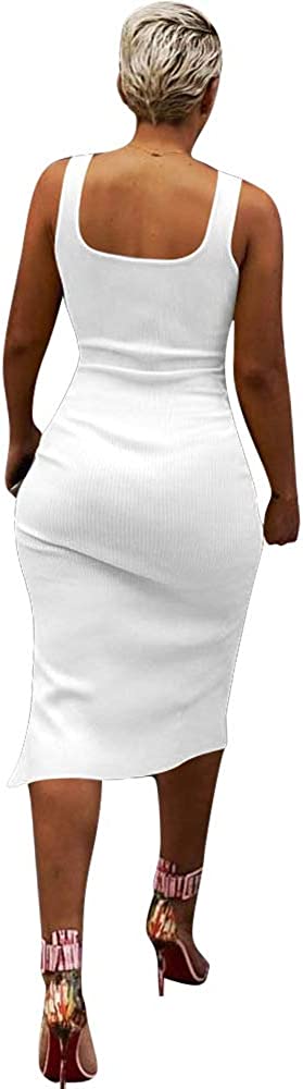 Womens Sexy Soild Sleeveless Strap Tank Ribbed Buttons Side Split Bodycon Irregular Long Pencil Midi Dress