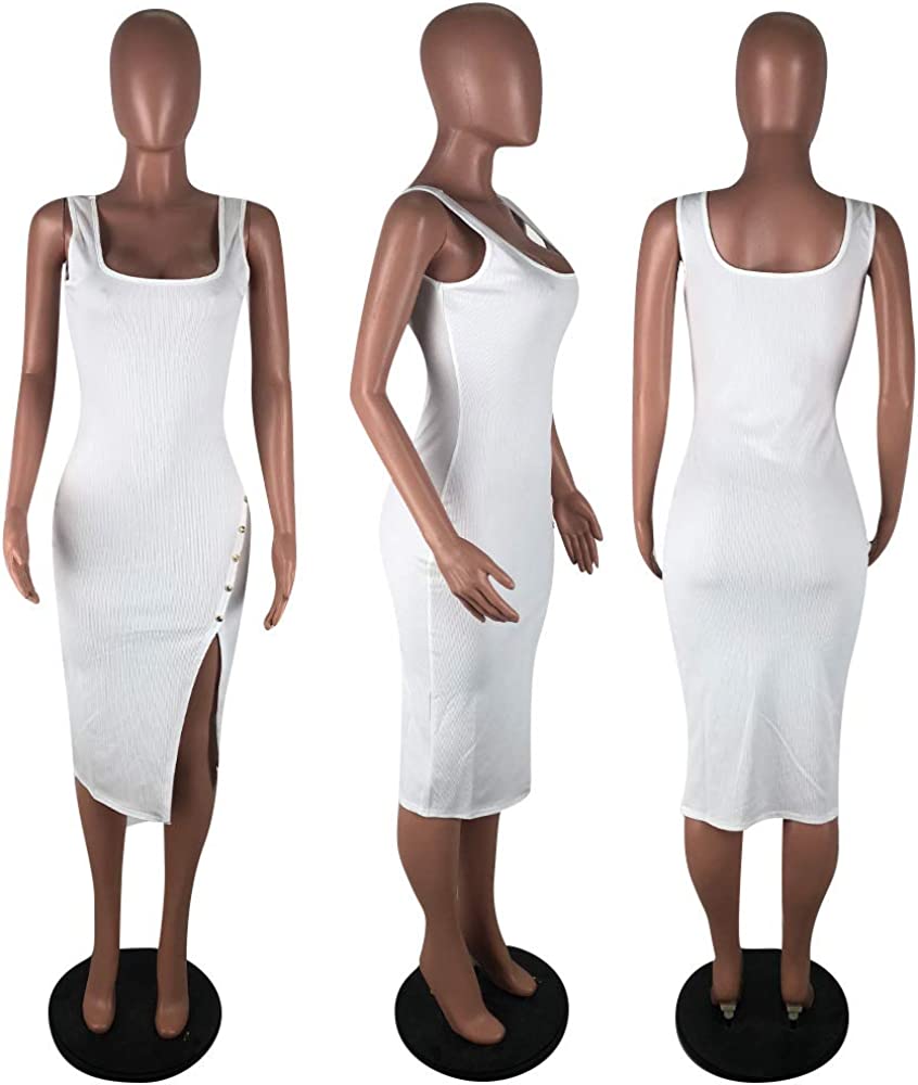 Womens Sexy Soild Sleeveless Strap Tank Ribbed Buttons Side Split Bodycon Irregular Long Pencil Midi Dress