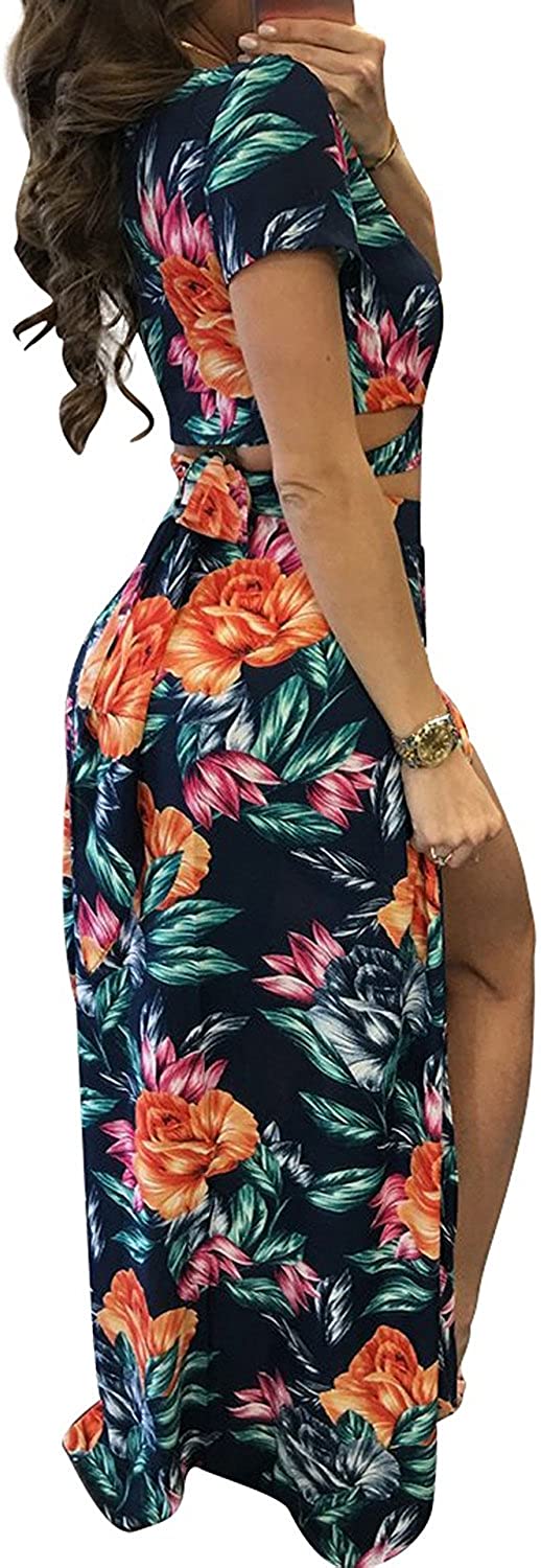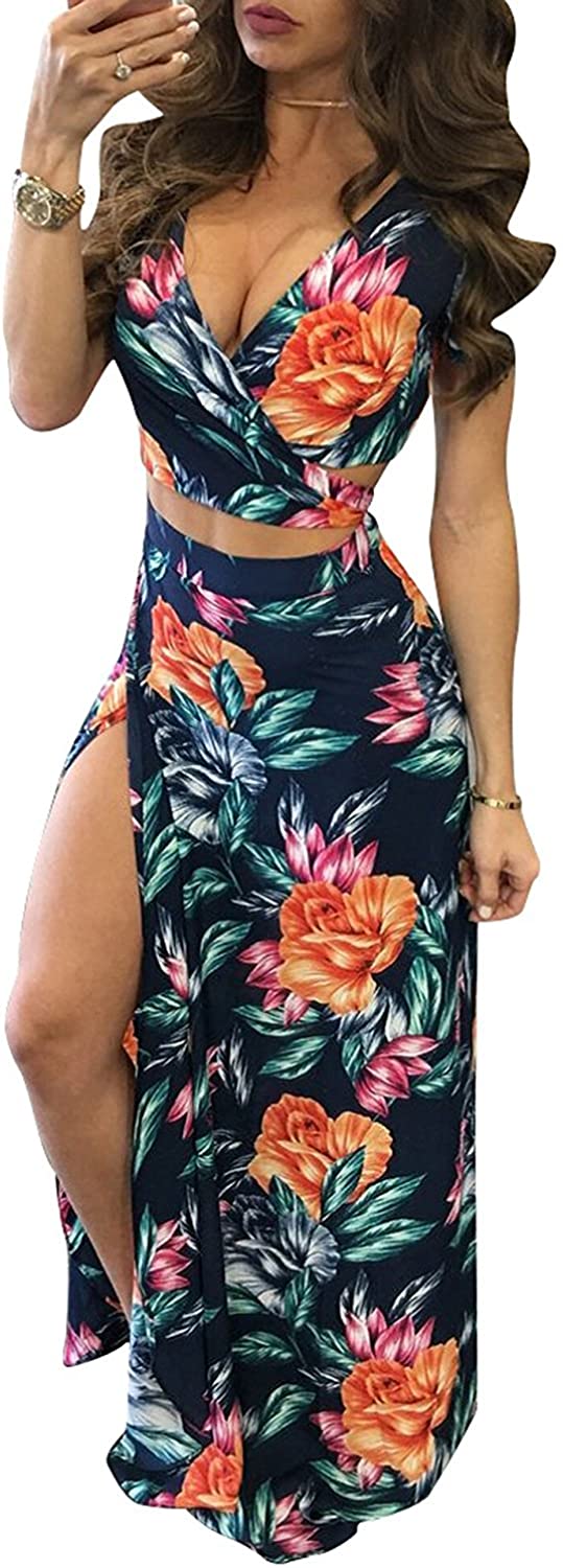 Women's Sexy V Neck Floral Printed Side Slit Two-Piece Maxi Dress