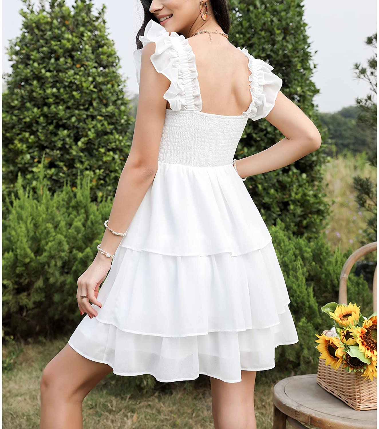 Womens Square Neck Sleeveless Ruffle Dress High Waist Backless Tiered Smocked Strappy Casual Short Mini Dresses