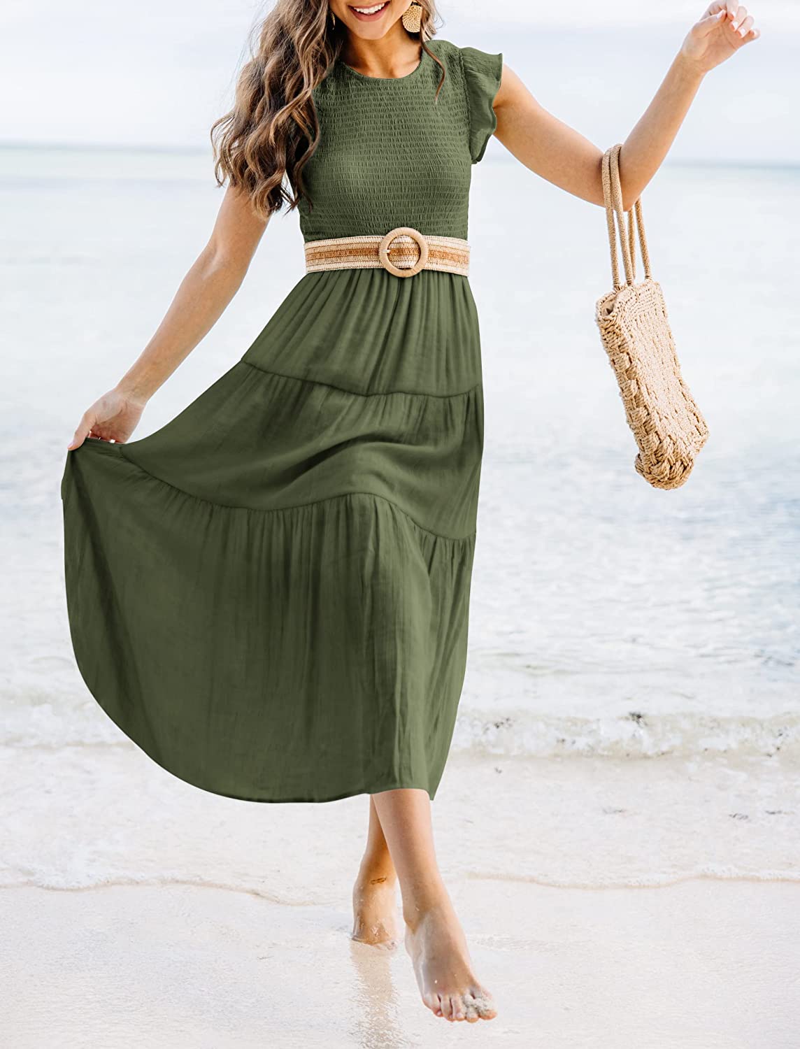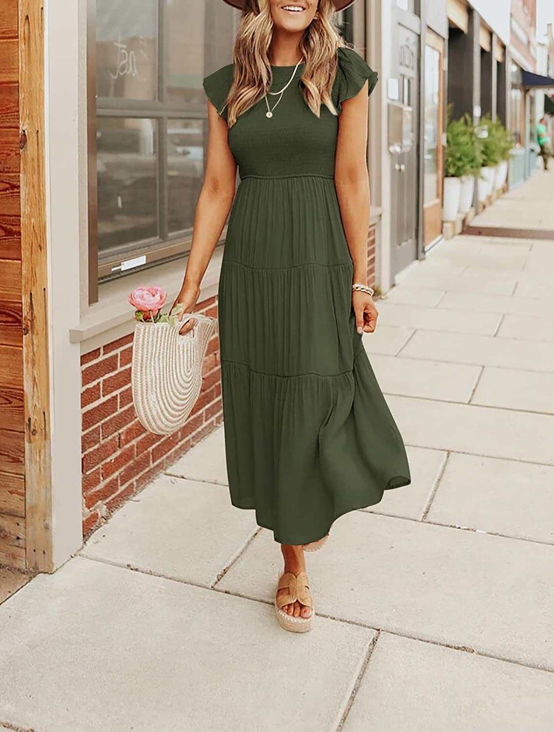 Women's Summer Casual Flutter Short Sleeve Crew Neck Smocked Elastic Waist Tiered Midi Dress
