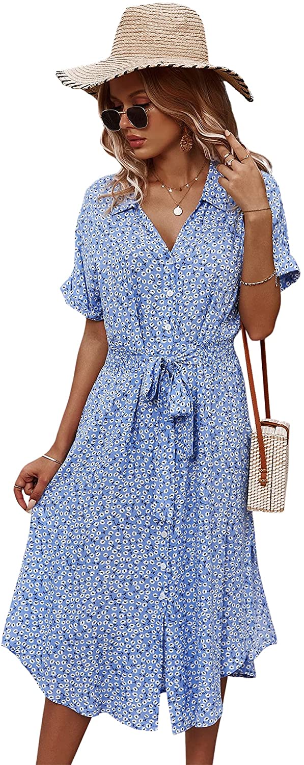 Womens Summer Dress Casual Ditsy Floral Tie Front Button Up Boho Midi Tshirt Dresses