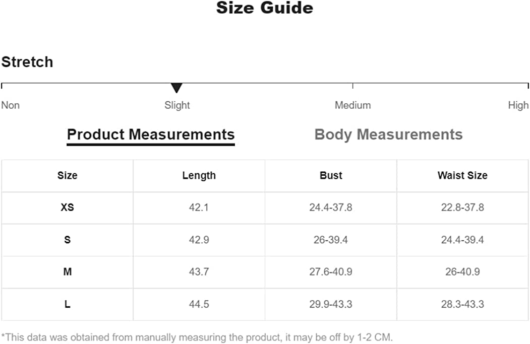 Size Chart: X-Small——Length:42.1", Bust:24.4-37.8", Waist Size:22.8-37.8"/ Small——Length:42.9", Bust:26-39.4", Waist Size:24.4-39.4"/ Medium——Length:43.7", Bust:27.6-40.9", Waist Size:26-40.9"/ Large——Length:44.5", Bust:29.9-43.3", Waist Size:28.3-43.3"/