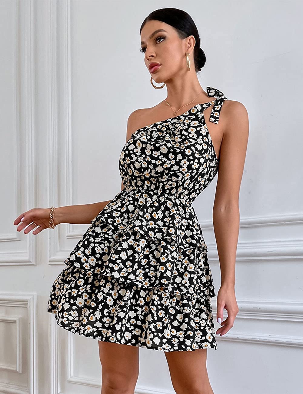 Women's Summer Tie One Shoulder Boho Floral Dress Elastic Waist Tiered Ruffle A Line Flowy Mini Dresses