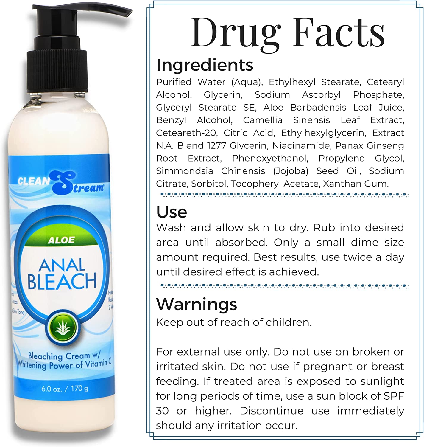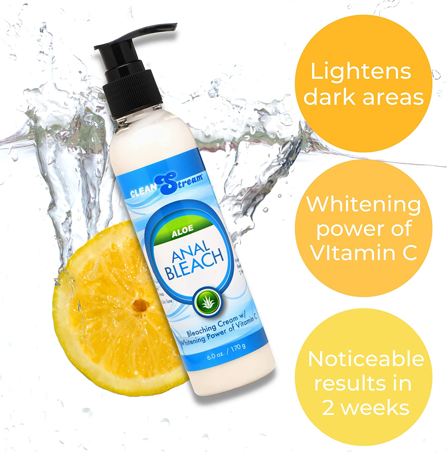 Only a small amount is needed to whiten, brighten, and gently bleach your anal area! Vitamin C contains powerful antioxidants which encourage cellular renewal, boost collagen, improves skin tone and helps to correct excess pigmentation. The convenient, mess-free pump top lets you squeeze out just the right amount. Made with natural ingredients such as soothing aloe, ginseng, green tea extract, and citrus for gentle, impressive results! Size: 6 fl. oz. Active Ingredients: Vitamin C. Note: Do not use if pregnant or breastfeeding.
