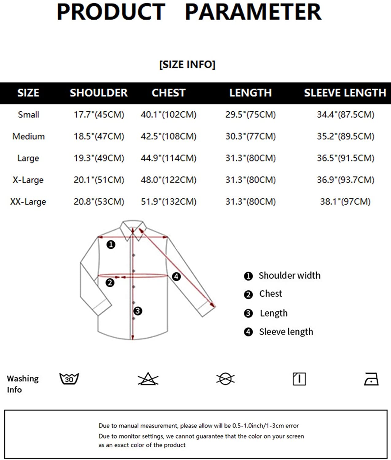 S- Shoulder: 17.7"/Chest: 40.1"/ Length: 29.5"/ Sleeve: 34.4"