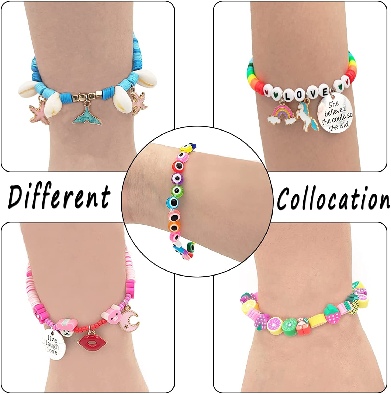 Polymer Clay beads kit includes 4000pcs flat clay beads in 20 colors and 280pcs charms kit (contains pendants, jump rings, 2 set full A-Z letter beads and 8 heart beads, lobster clasp, etc.), 4 rolls of 10 meters elastic strings,300 pcs of thick fruit smile clay beads,150 pcs of colorful eye beads,150 pcs small beads,15 pcs unicorn mermaid pendant.