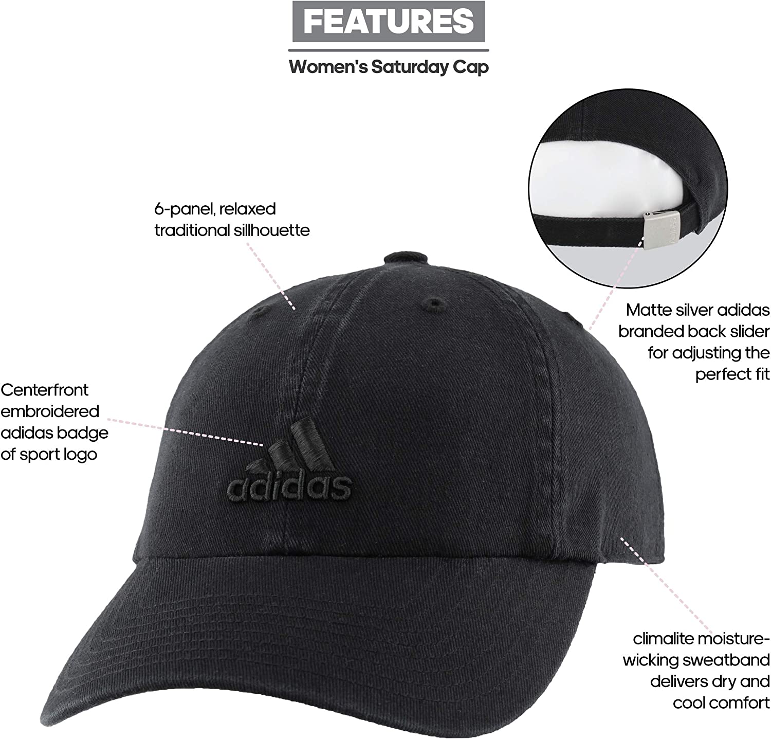 The cap every athlete needs in her closet. Simple and classic, the saturday cap is the perfect accessory to throw on for a long run or coffee run. Designed with a lightweight, washed cotton twill, embroidered centerfront adidas logo, and adjustable matte silver slider. Bad hair days never looked so good.