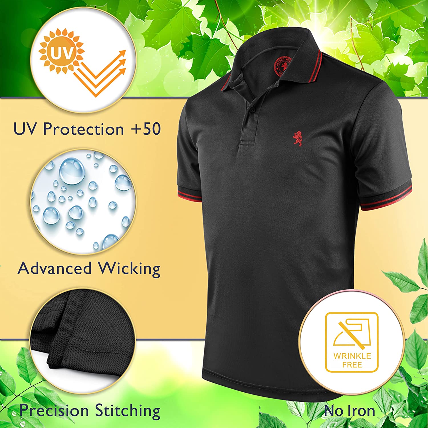 ALBERT MORRIS polo shirts are built to last. Constructed from a high-tech fabric, the shirts will not fade in the wash nor shrink in the dryer. This advanced moisture wicking material with UV sun protection, helps you stay dry and fresh all-day long. Reinforced ventilation holes in the underarms offer additional temperature control. Precision stitching ensures a high-quality finish.