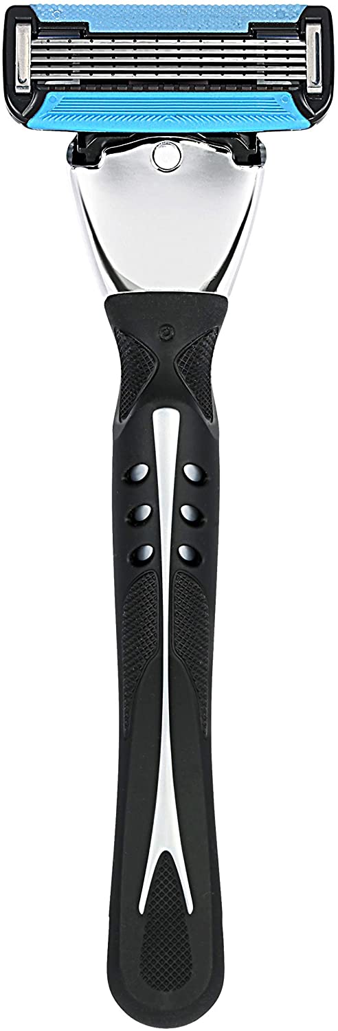 Solimo 5-Blade MotionSphere Razor for Men features a multi pivot design to follow the contours of your face and a beard trimmer for shaving goatee, sideburns and under nose. The razor cartridge is hypoallergenic, includes a lubricating strip with vitamin E, and has an anti-clog design for quick rinse. To load refill cartridge, push razor handle into a cartridge as it sits in the dispenser until it clicks. Cartridges fit Solimo Razor Handles only; does not fit other brands.
