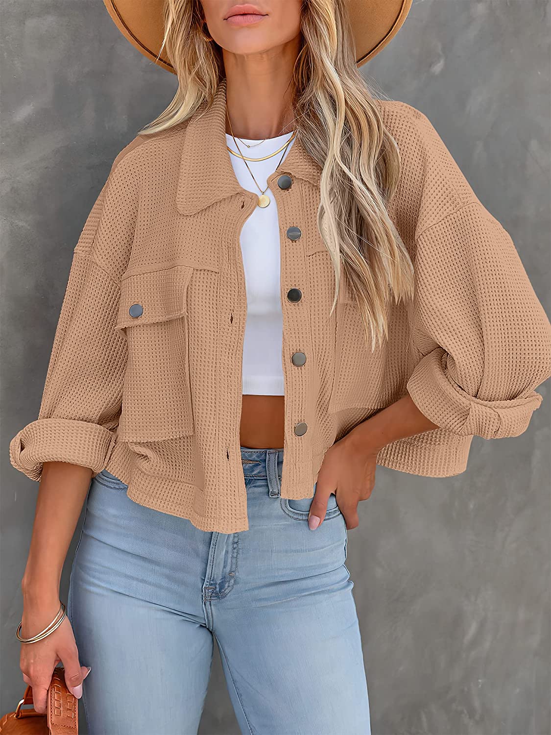 ANRABESS Women Waffle Knit Cropped Shacket Shirt Long Sleeve Collared Button Down Pockets Thermal Jacket Coat