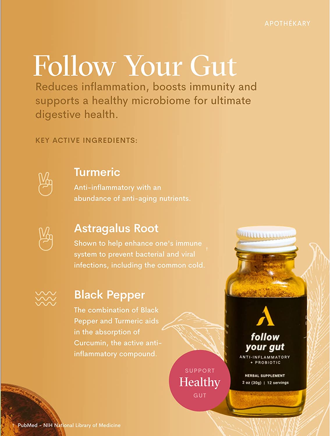 Follow Your Gut is an immune-boosting, adaptogen-infused herbal blend with digestive benefits. The combination of black pepper and turmeric help to increase the bioavailability of the compound Curcumin, making it a powerful tonic for post-workout recovery, digestive support, and a recipe for a metabolic reset. Astragalus and Cayenne Pepper are both powerful metabolism boosters, and ginger helps aid in digestion.